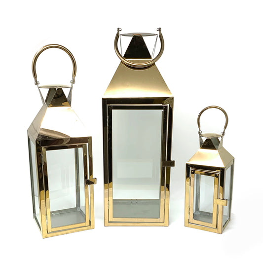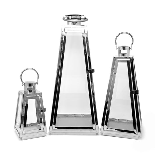 Allgala Lanterns 3-PC Set Jumbo Indoor/Outdoor Hurricane Candle Lantern Set with Chrome Plated Structure and Tempered Glass-Pyramid Top