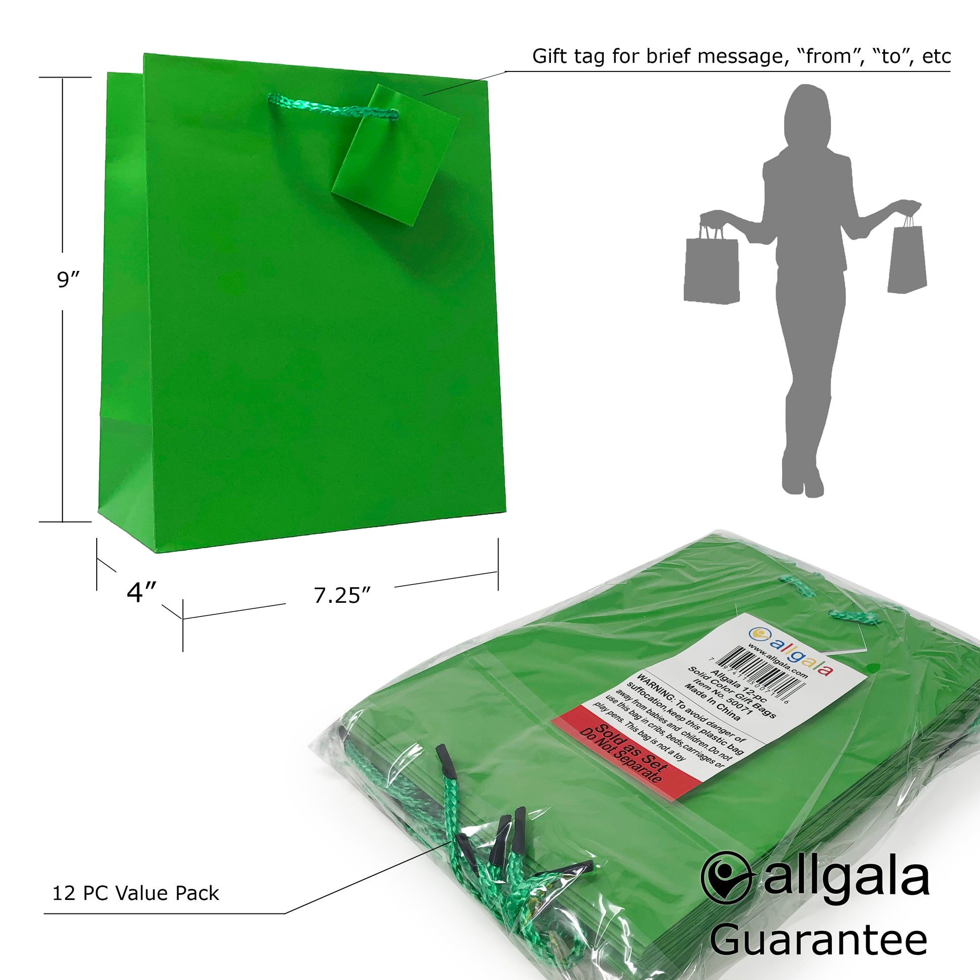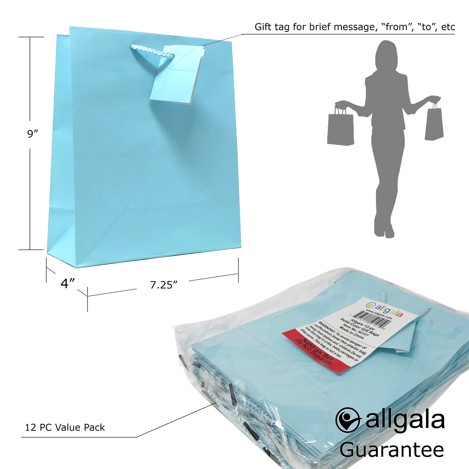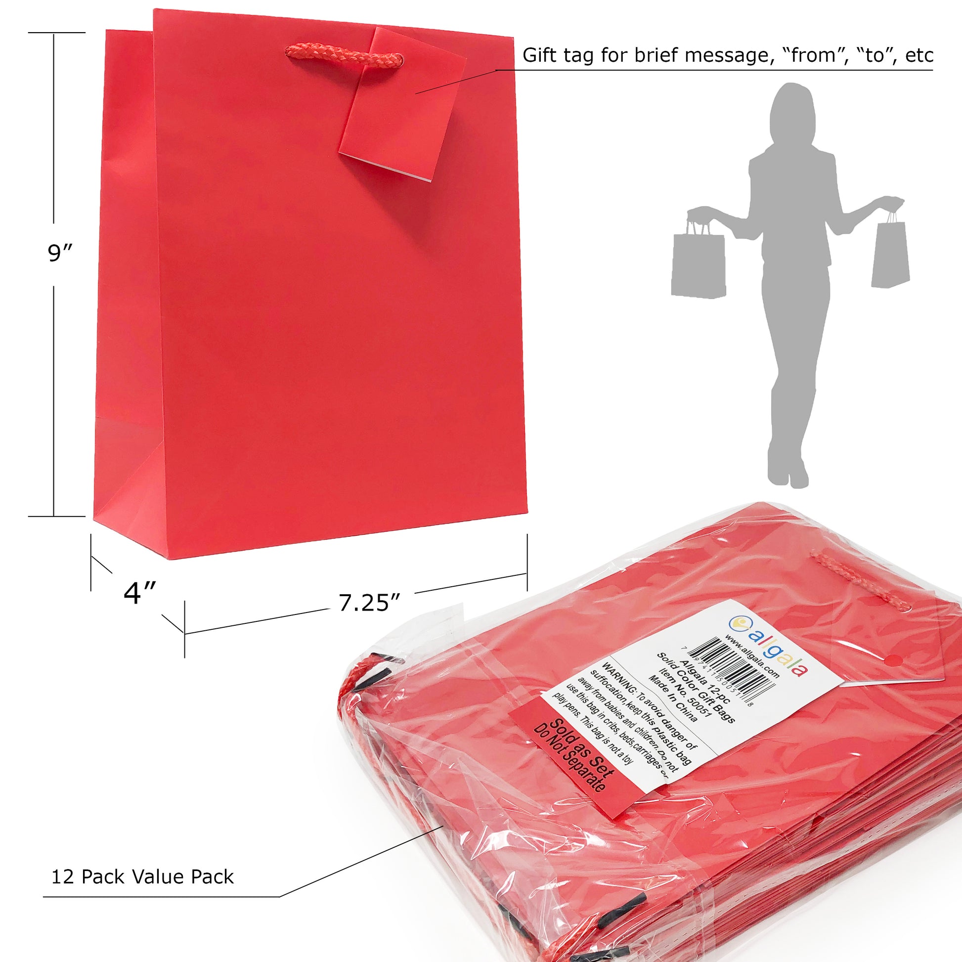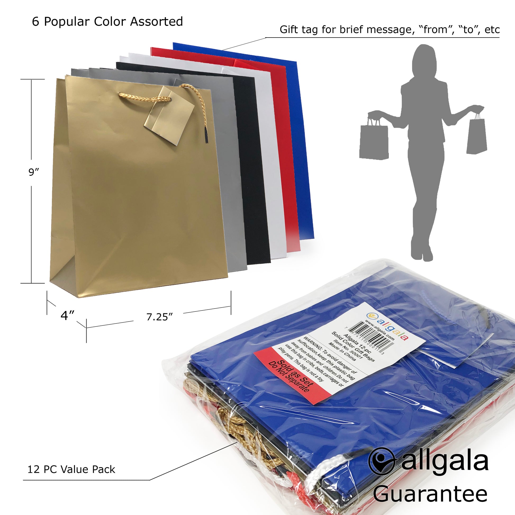 Allgala Gift Bags 12PK Value Premium 9" Medium 157GSM Art Paper Solid Color Paper Gift Bags with Matte Lamination