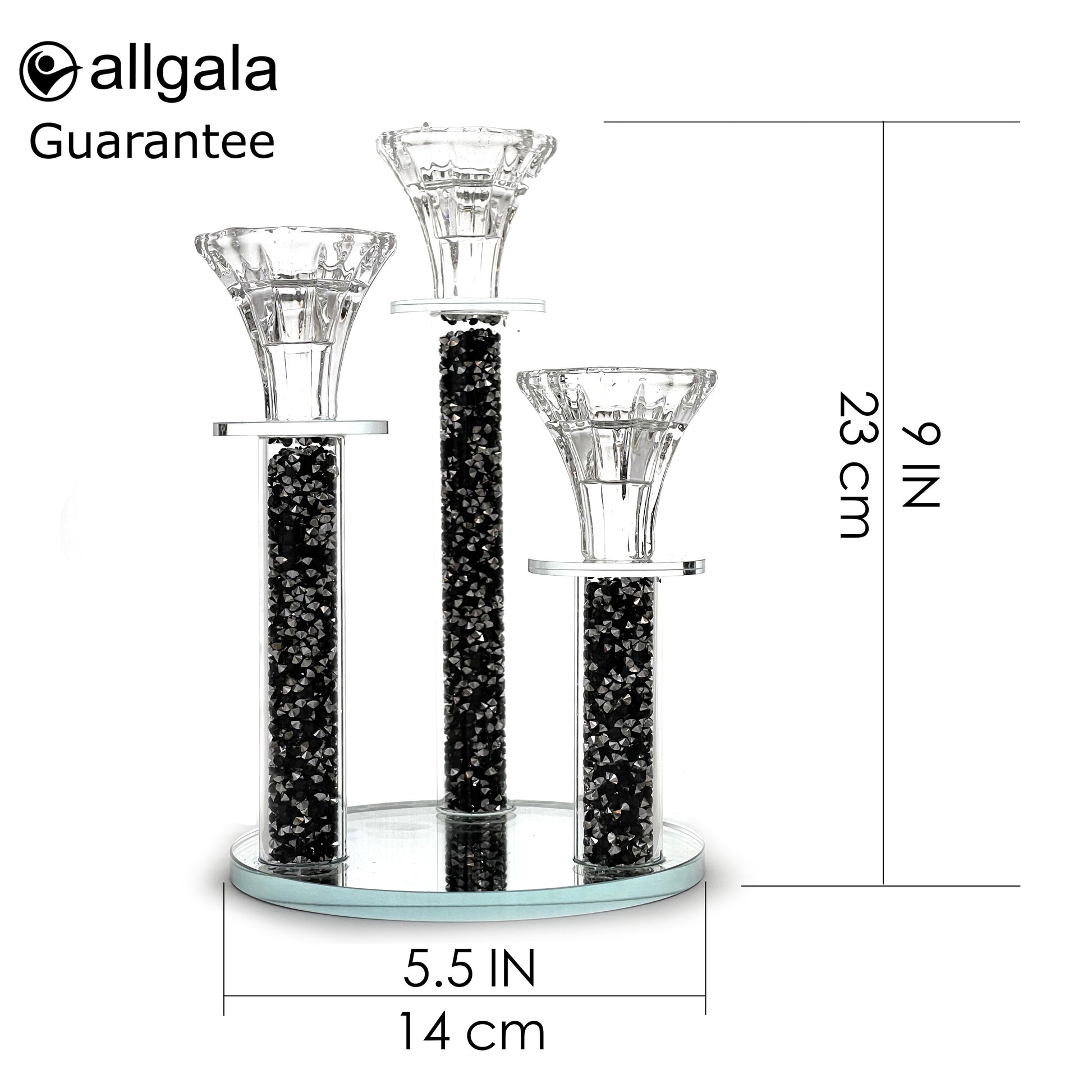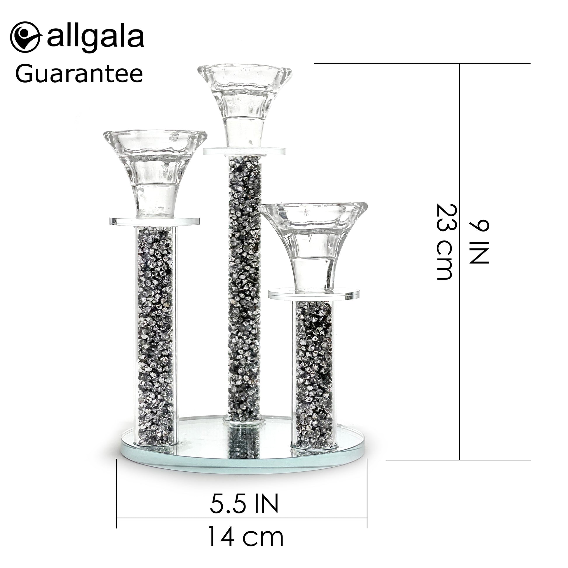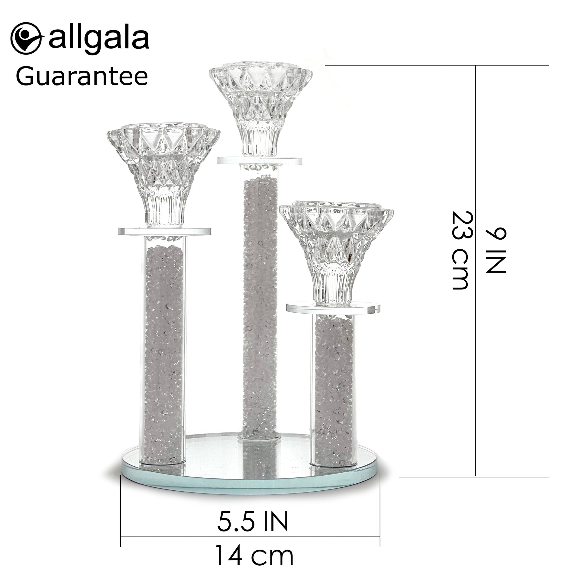 Allgala 9 Inch Tall 3-Pillar Filled with Diamond Like Stone Filled Crystal Candlesticks with Mirror Base