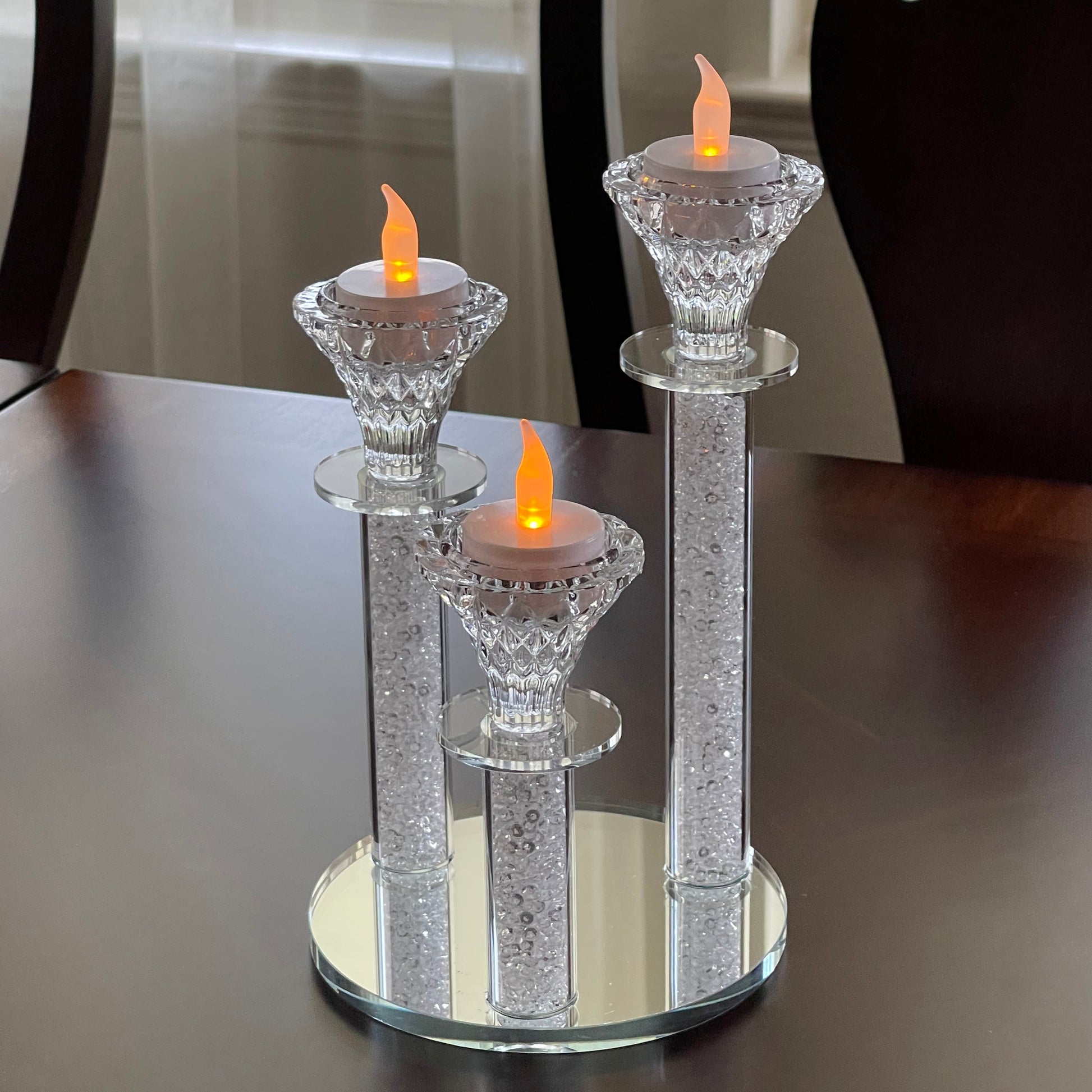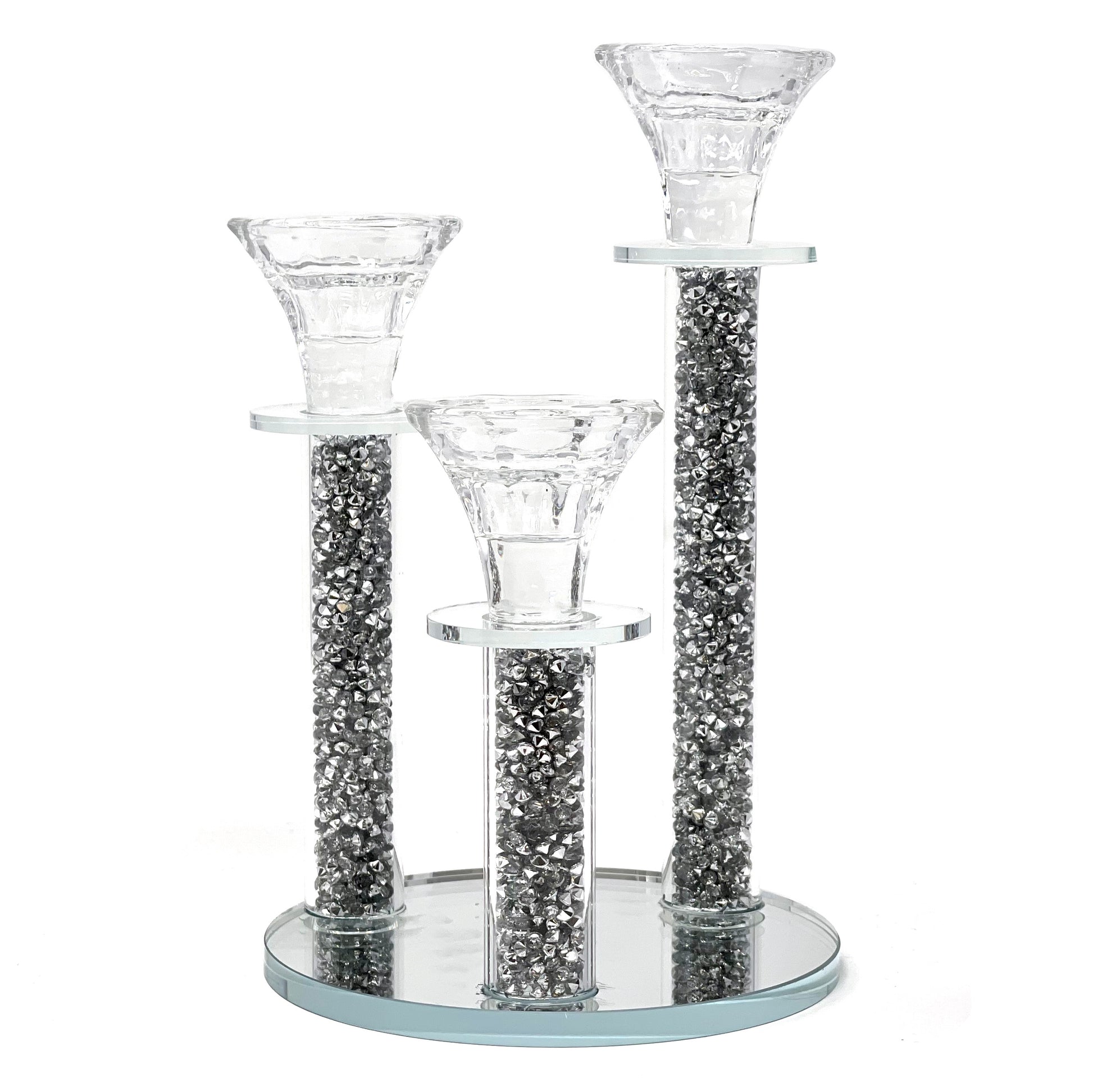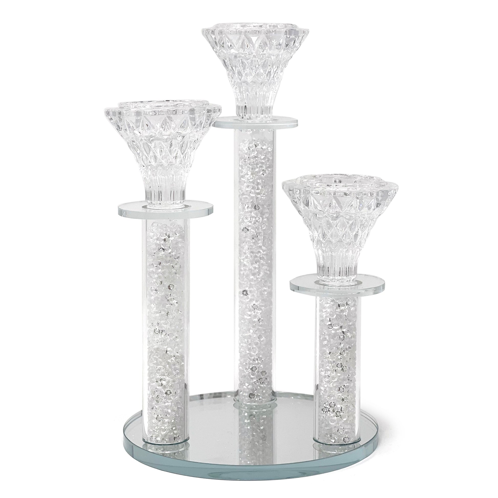 Allgala 9 Inch Tall 3-Pillar Filled with Diamond Like Stone Filled Crystal Candlesticks with Mirror Base