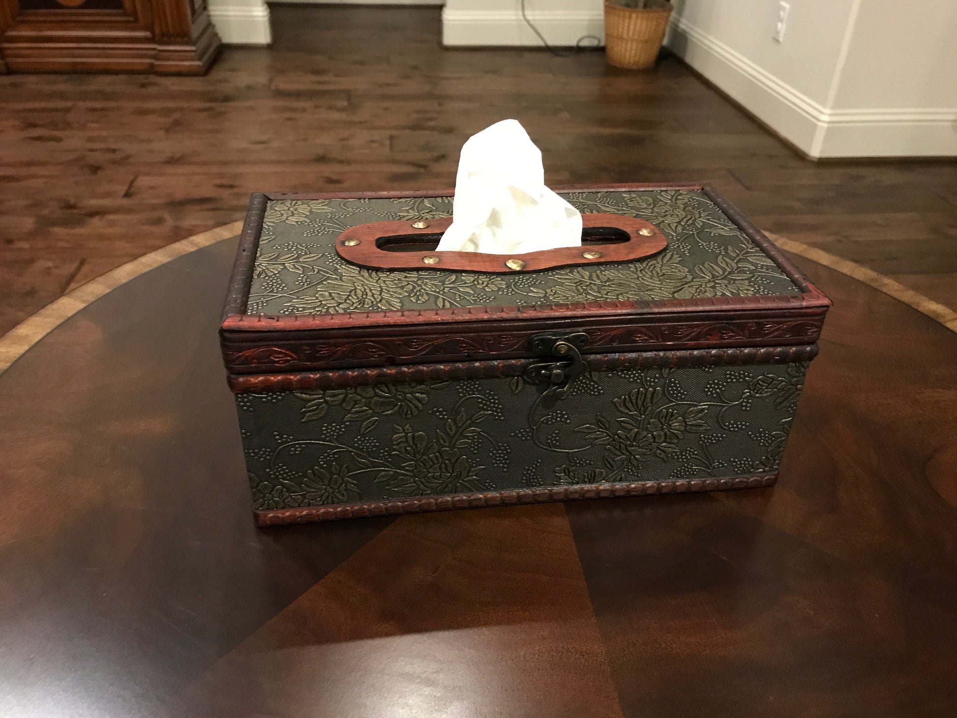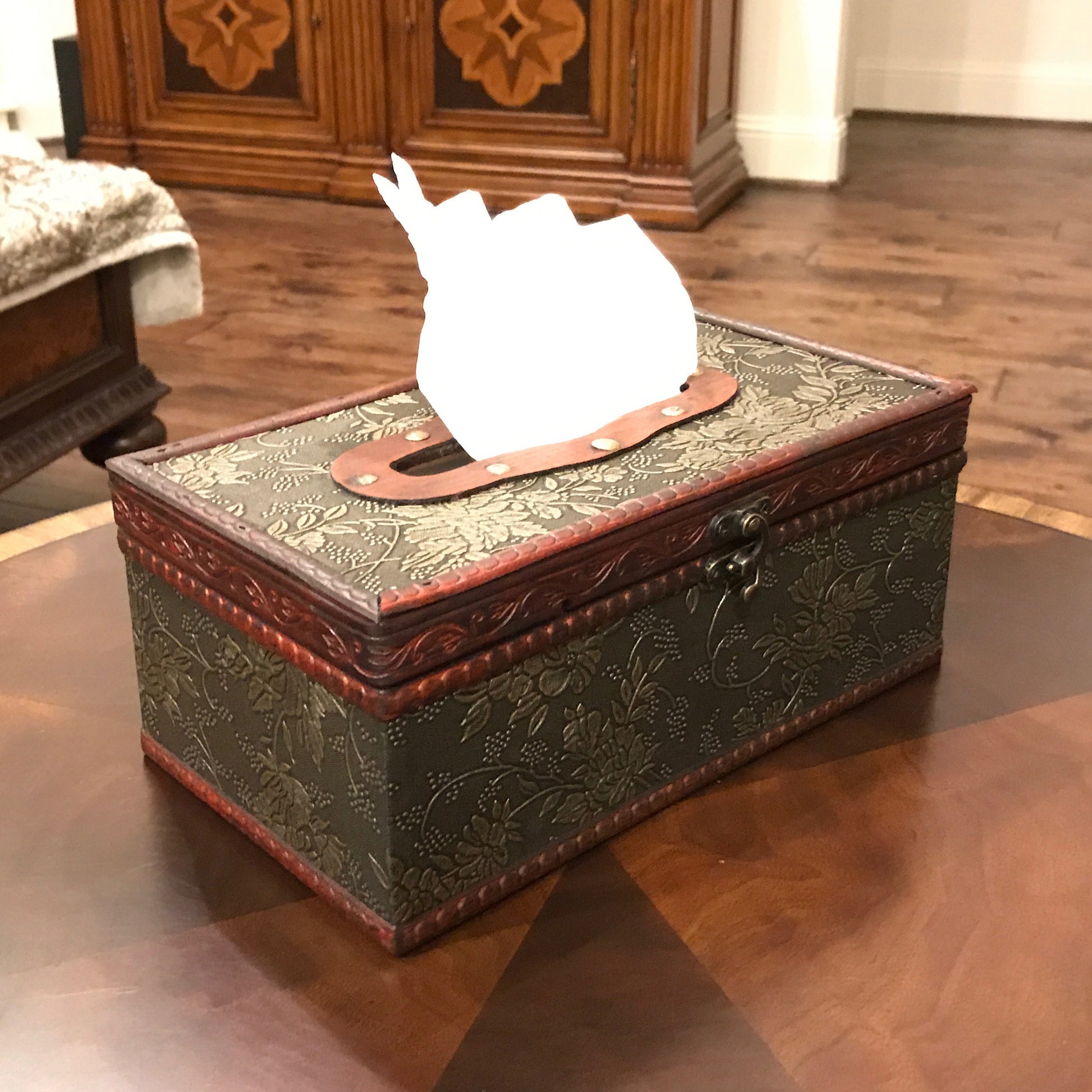 These beautiful little treasure boxes are hand stained, hand crafted with real wood. Brass hinges, latch, handle and faux leather accent adds great details. You don't have to hide your "eye-sore" tissue box any more. Cover and dress up your regular paper tissue box, complimenting your home décor with this vintage and antique looking wooden box.