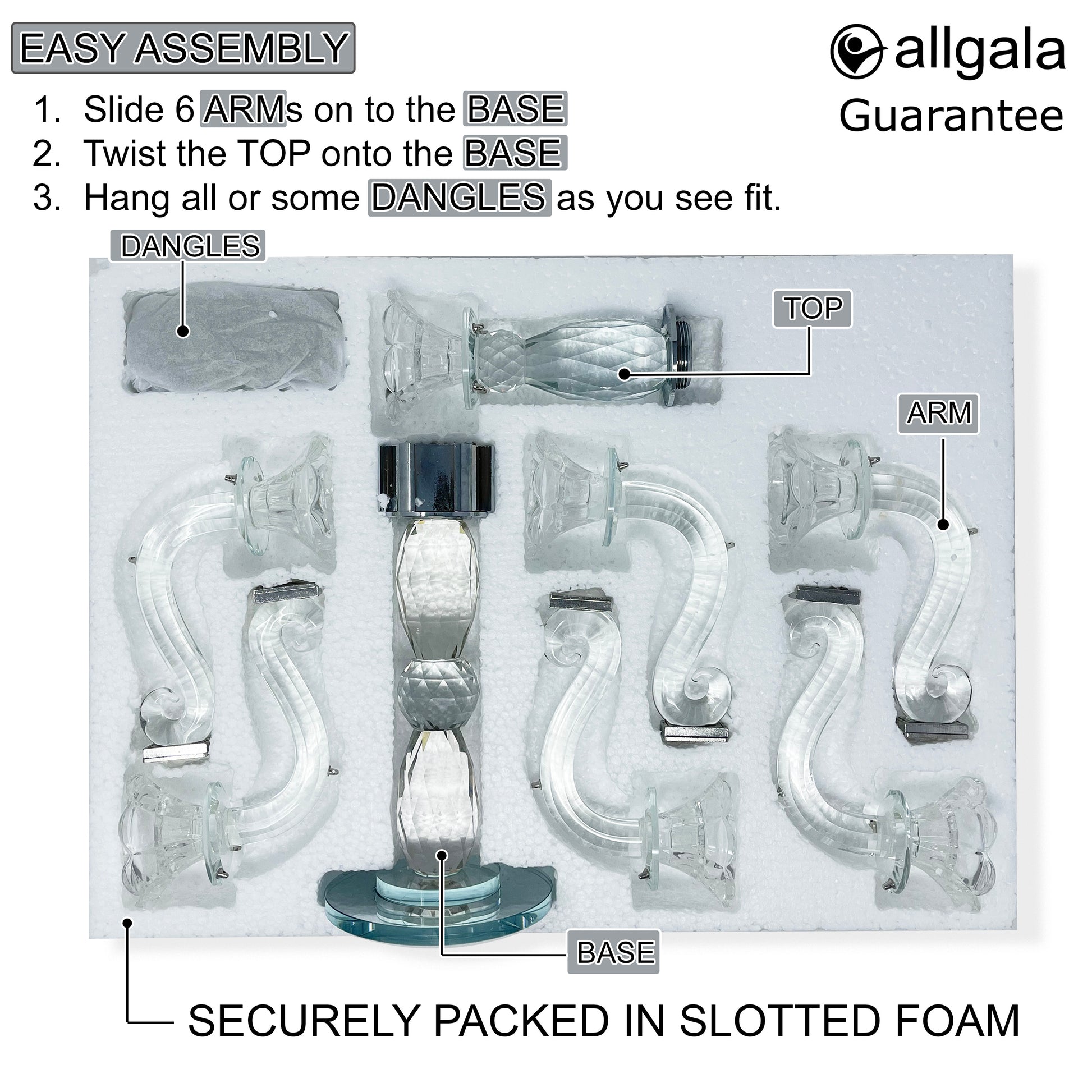 - Arms and body come in slotted foam padded box. Simply slide and twist on assembly. Hang on included up to 22 crystal glass drops for extra elegance and sparkle. Hang less dangles as you see fit if desire less busy.