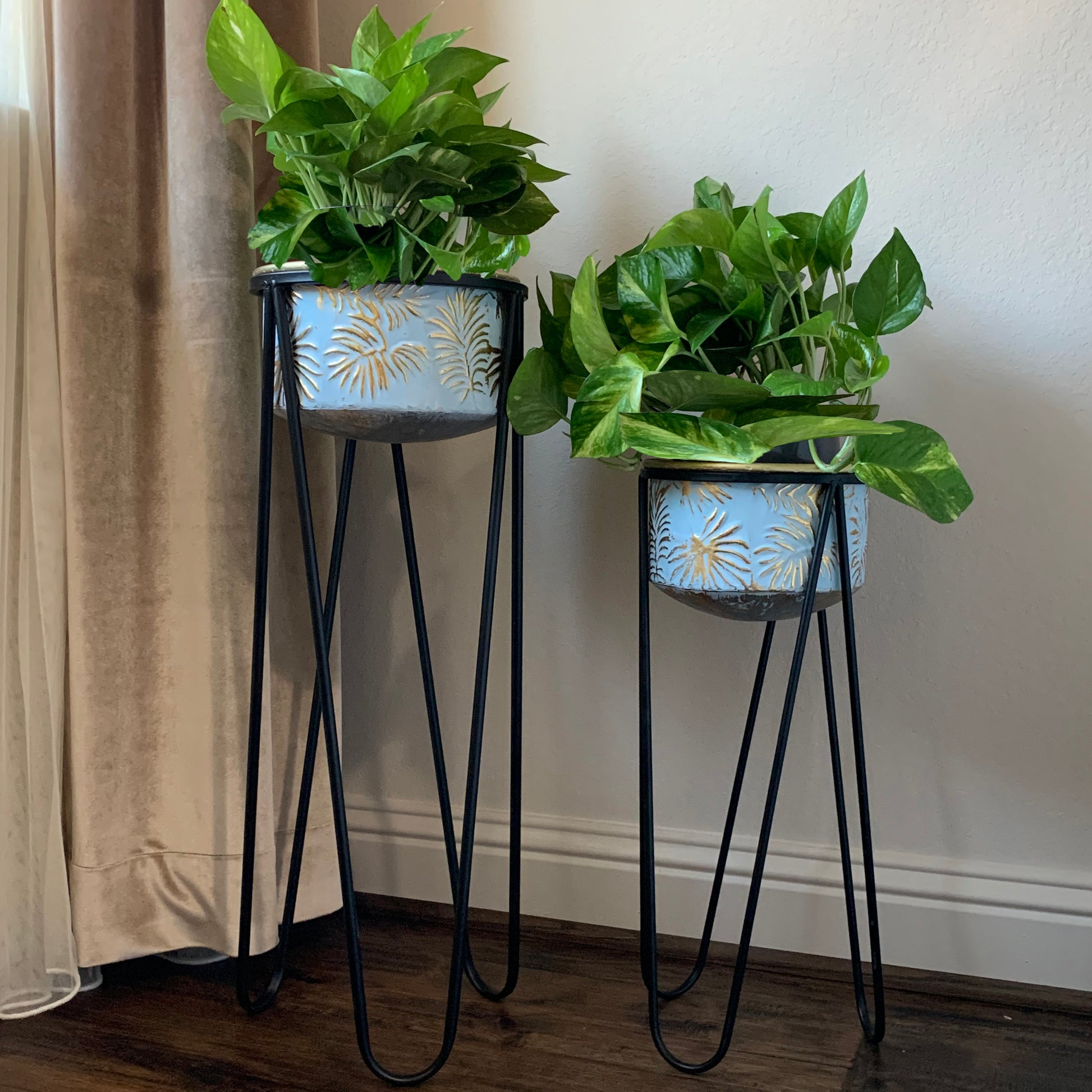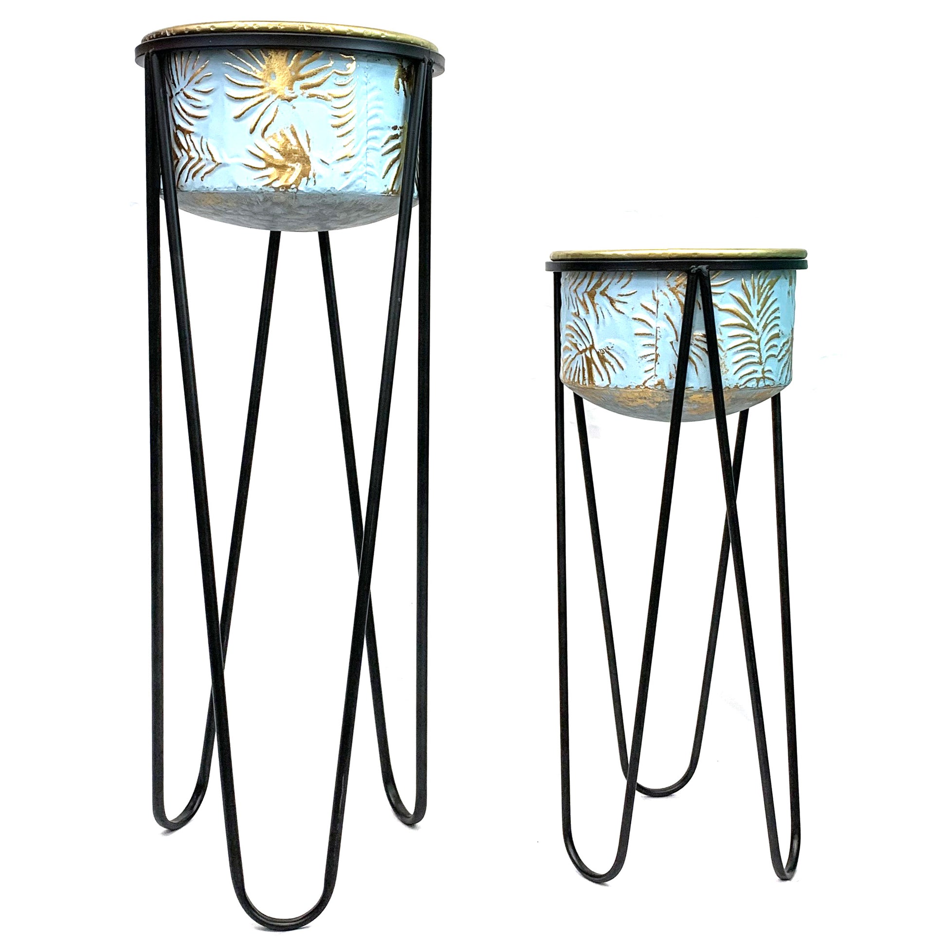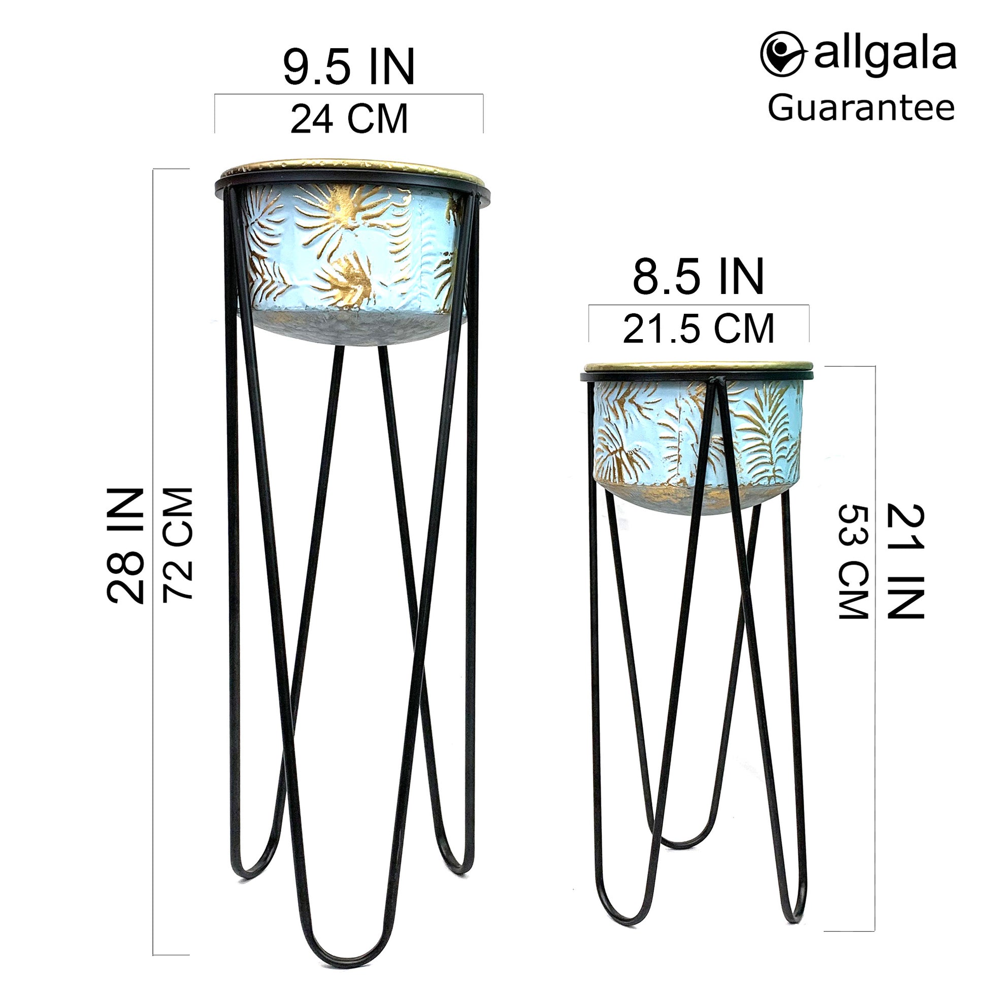 Allgala Planter Pot 2-PC Set Galvanized Planter Pot Blue Leaf Design with Iron Stands
