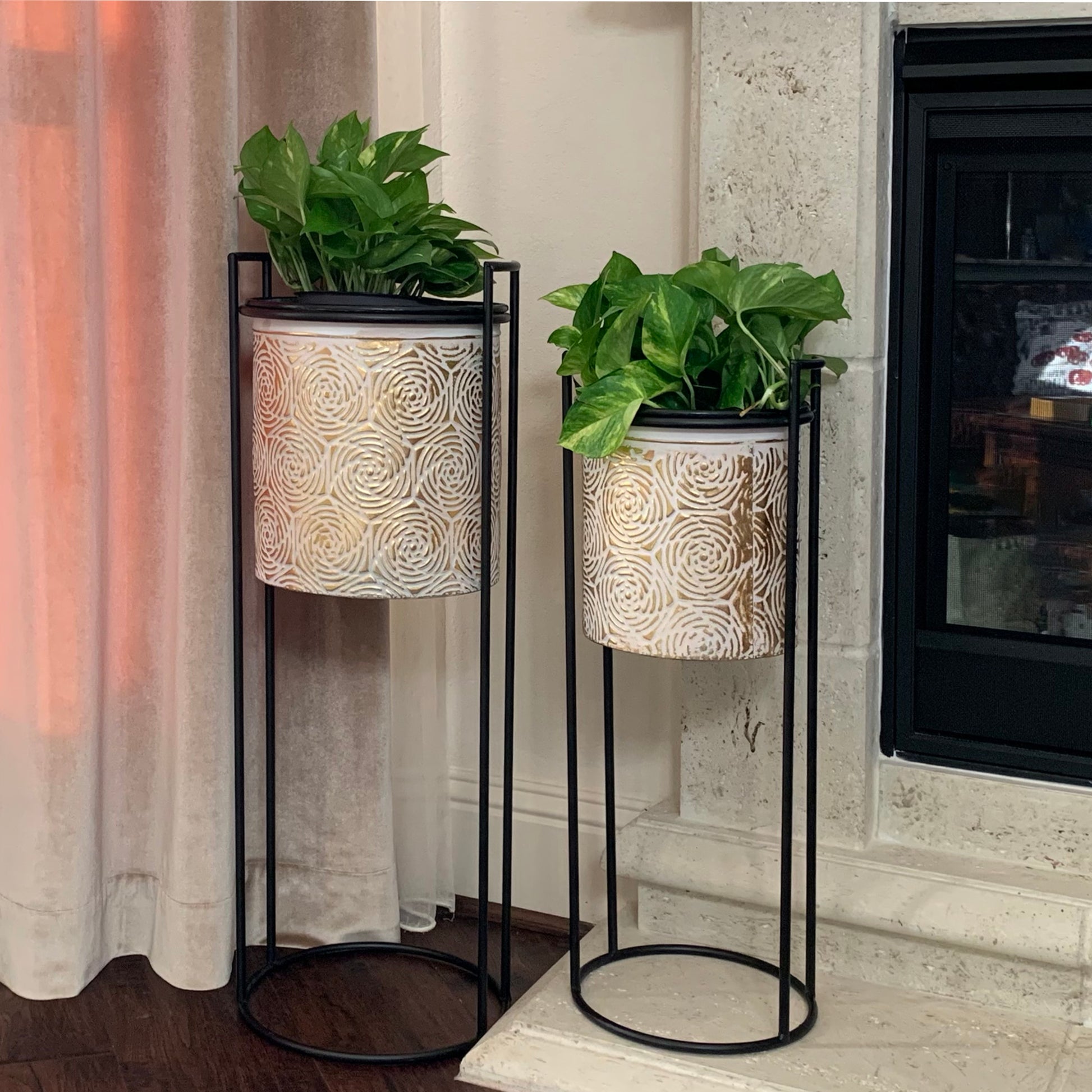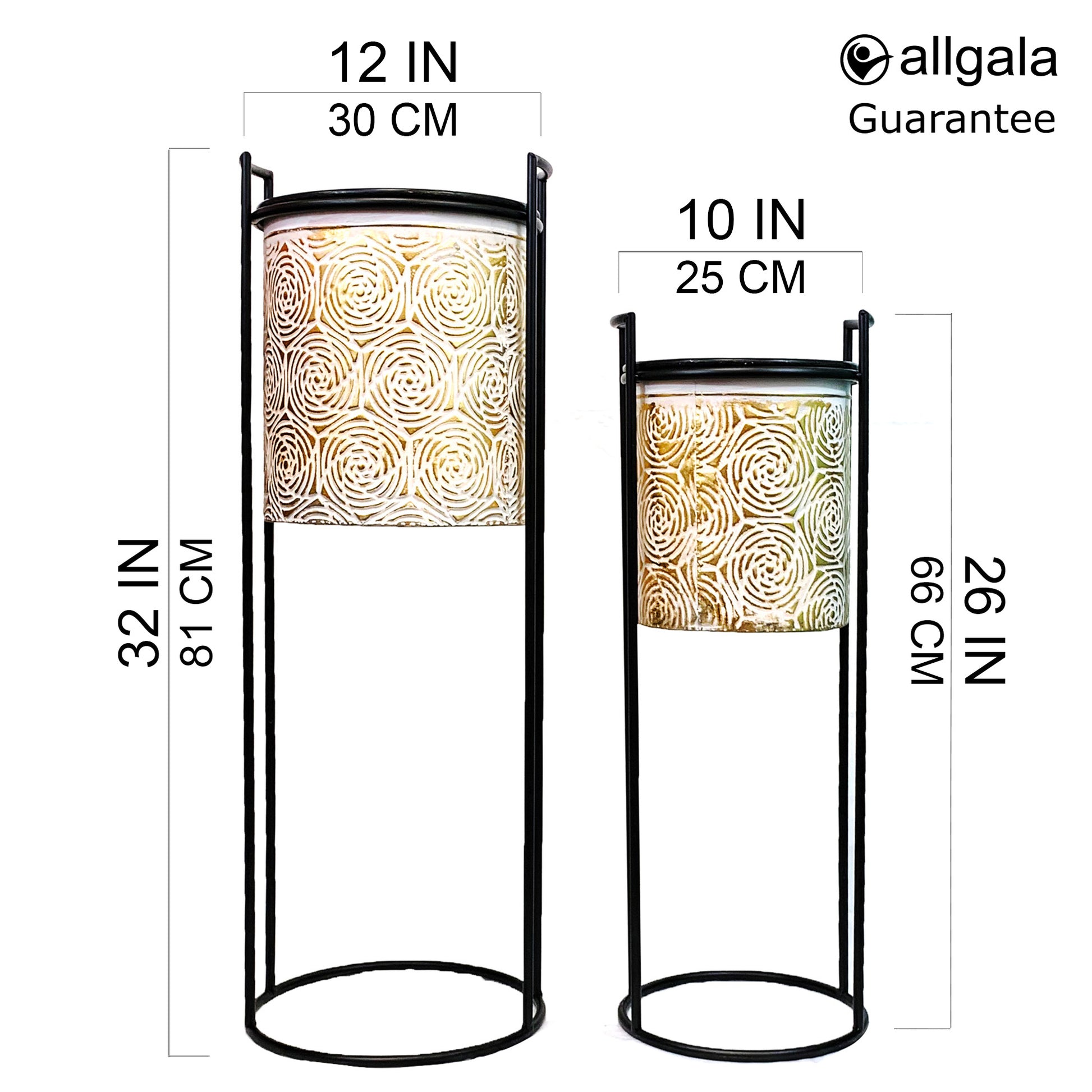 Allgala Planter Pot 2-PC Set Galvanized Planter Pot Gold Rose Design with Iron Stands