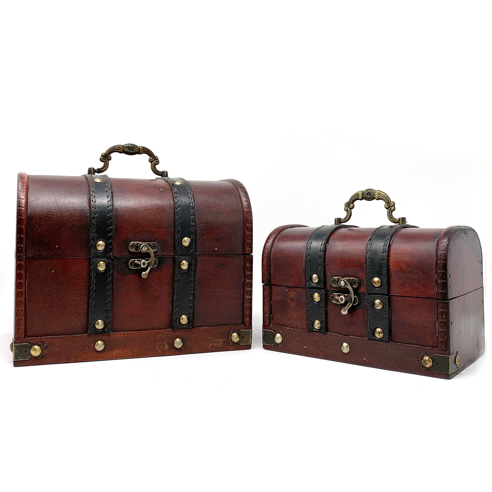 - Made of real wooden, metal hardware/locking latch, and Faux Leather Trim. Detailed trimmed edges. 2 pc treasue/Jewelry boxes nested in each other.