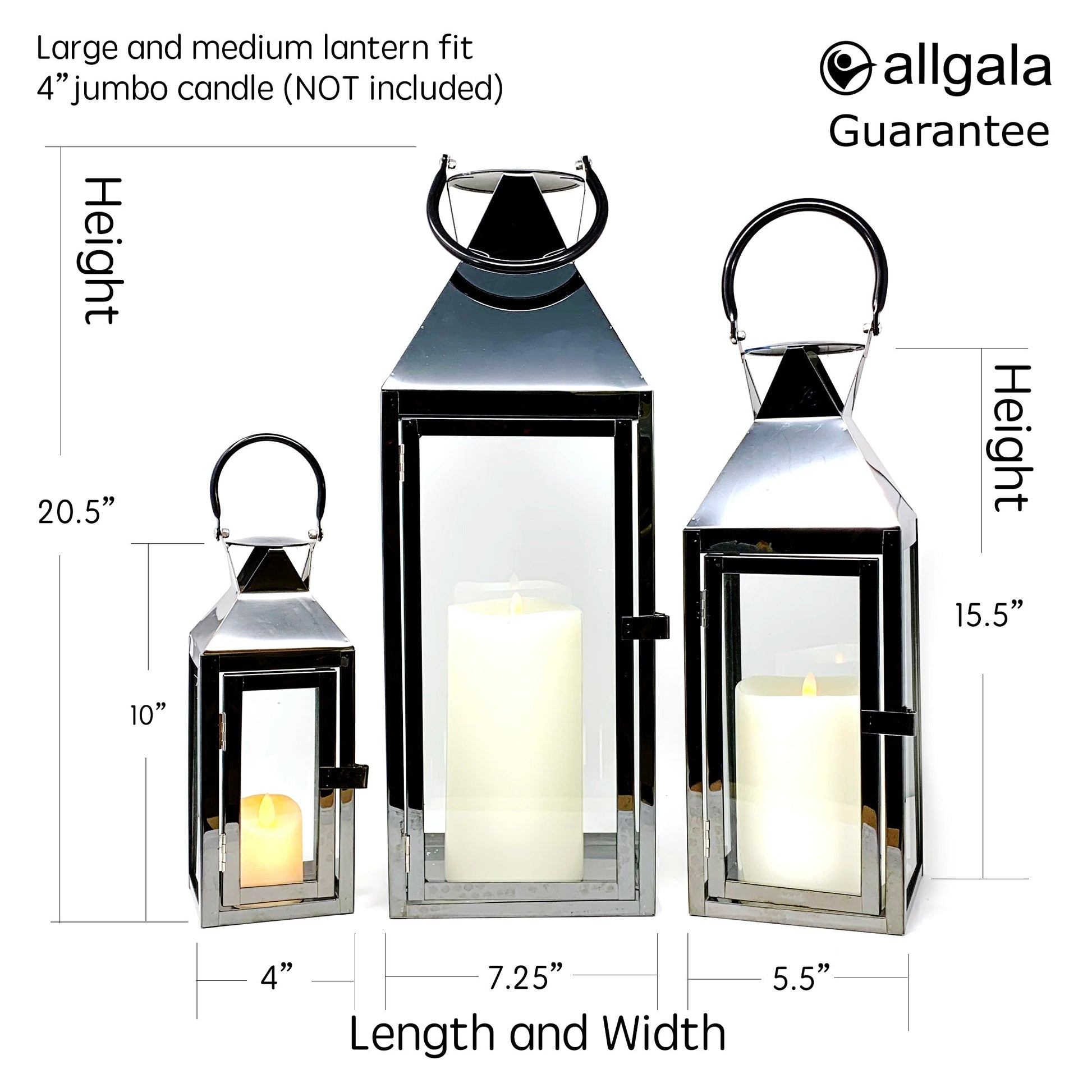 Allgala Lanterns 8 SET 3-PC Set Jumbo Indoor/Outdoor Hurricane Candle Lantern Set with Chrome Plated Structure and Tempered Glass-Pyramid Top