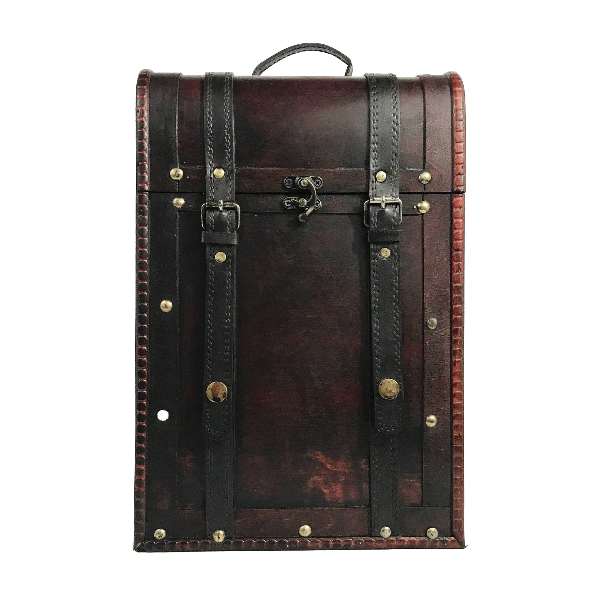 - Antique wood, leather like handle and straps, locking buckle, vintage in crafted detail