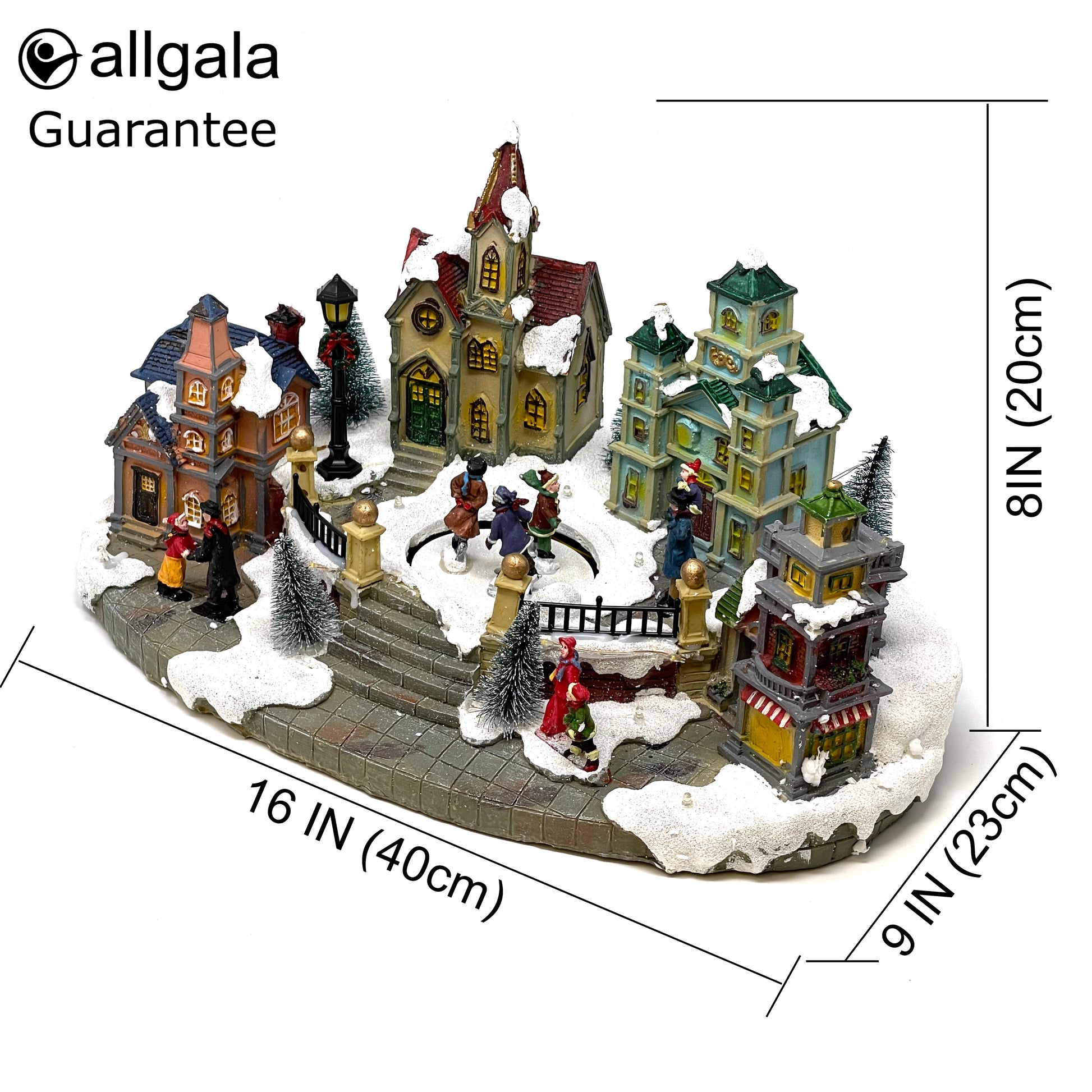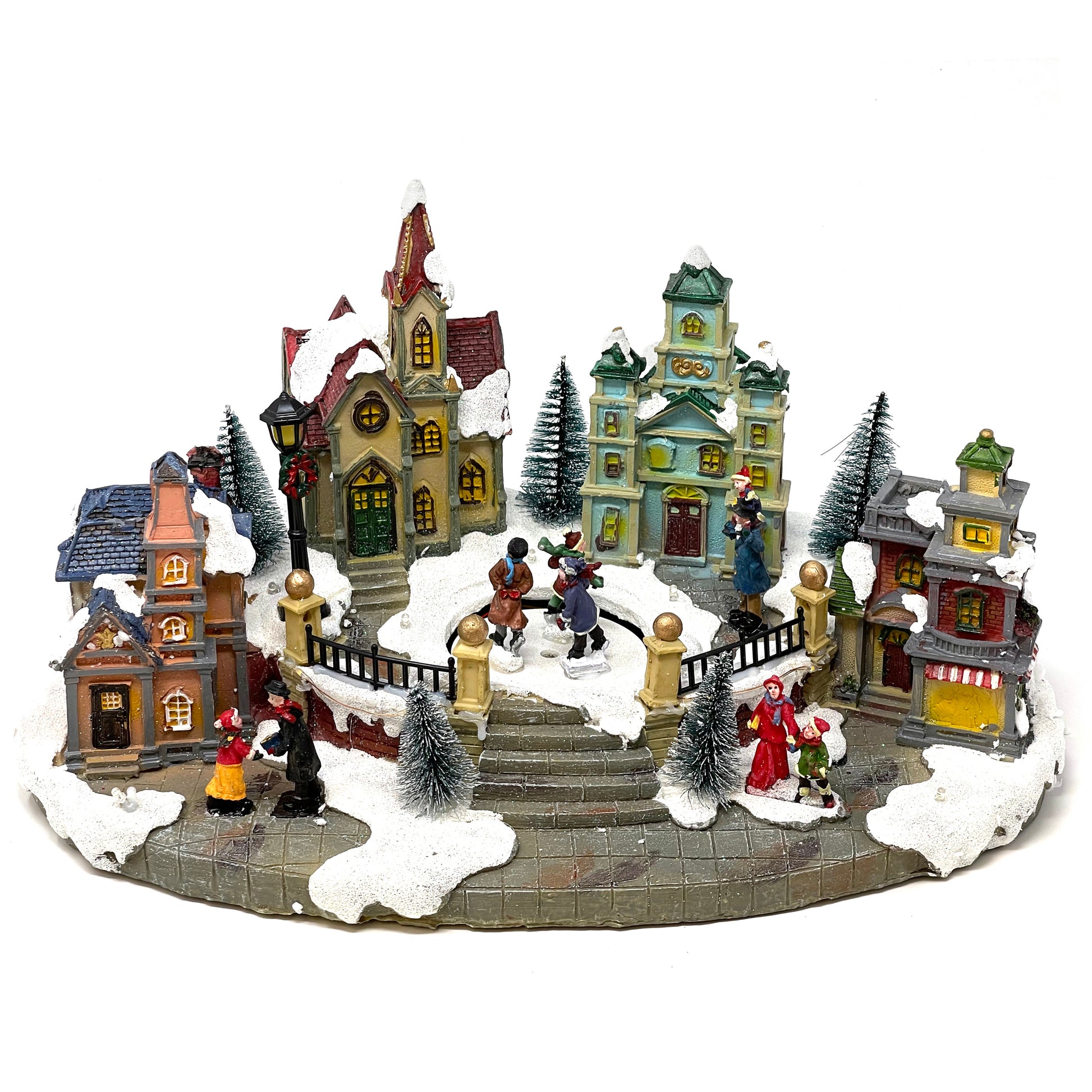 - Handcrafted in detail, with top quality polyresin and solid plastic material. Features moving skaters in a rink in the center of a Christmas village with houses, lively figurines..