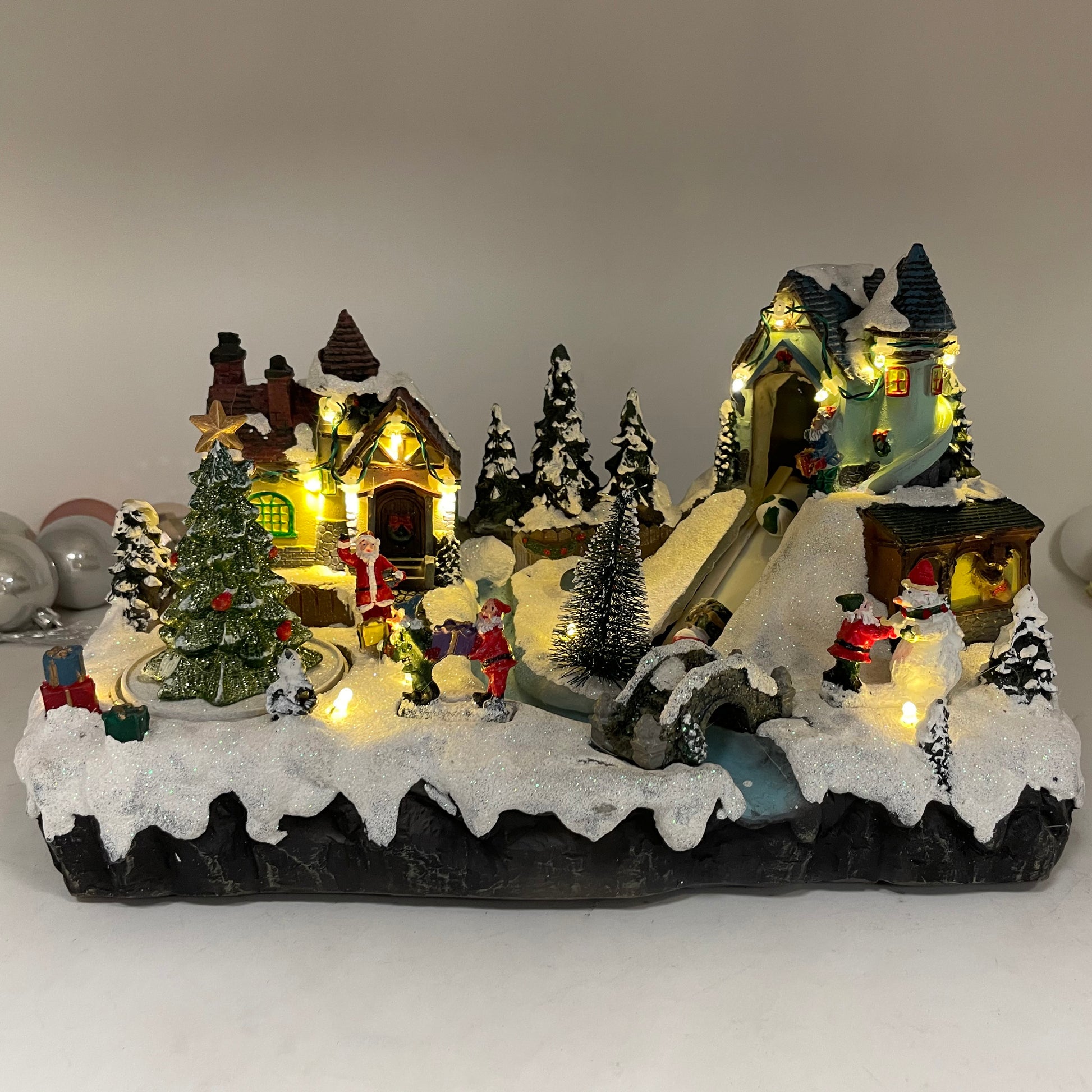 - Handcrafted in detail, with top quality resin material. Features Santa's village, busy elves handling toys and move toys with a conveyer belt.