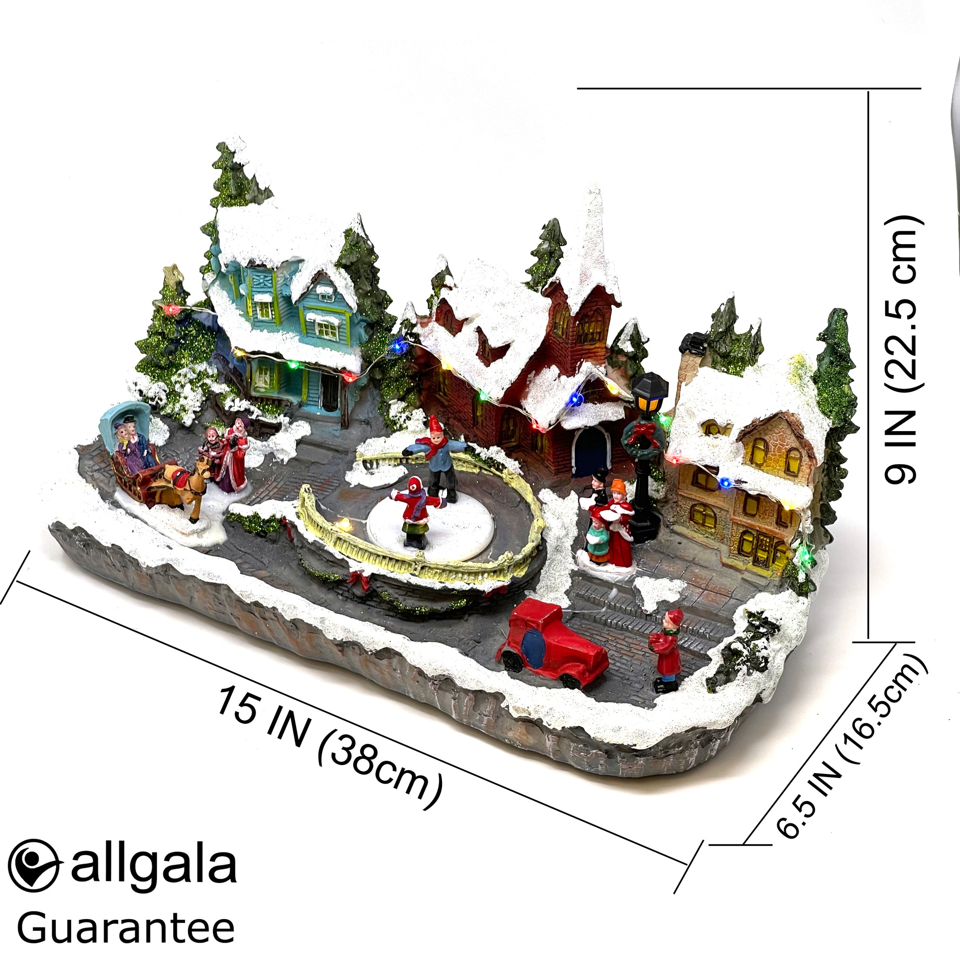 - Handcrafted in detail, with top quality polyresin and solid plastic material. Features a Christmas village with 3 houses, a few characters, and 2 skaters circlng in the middle of the village.