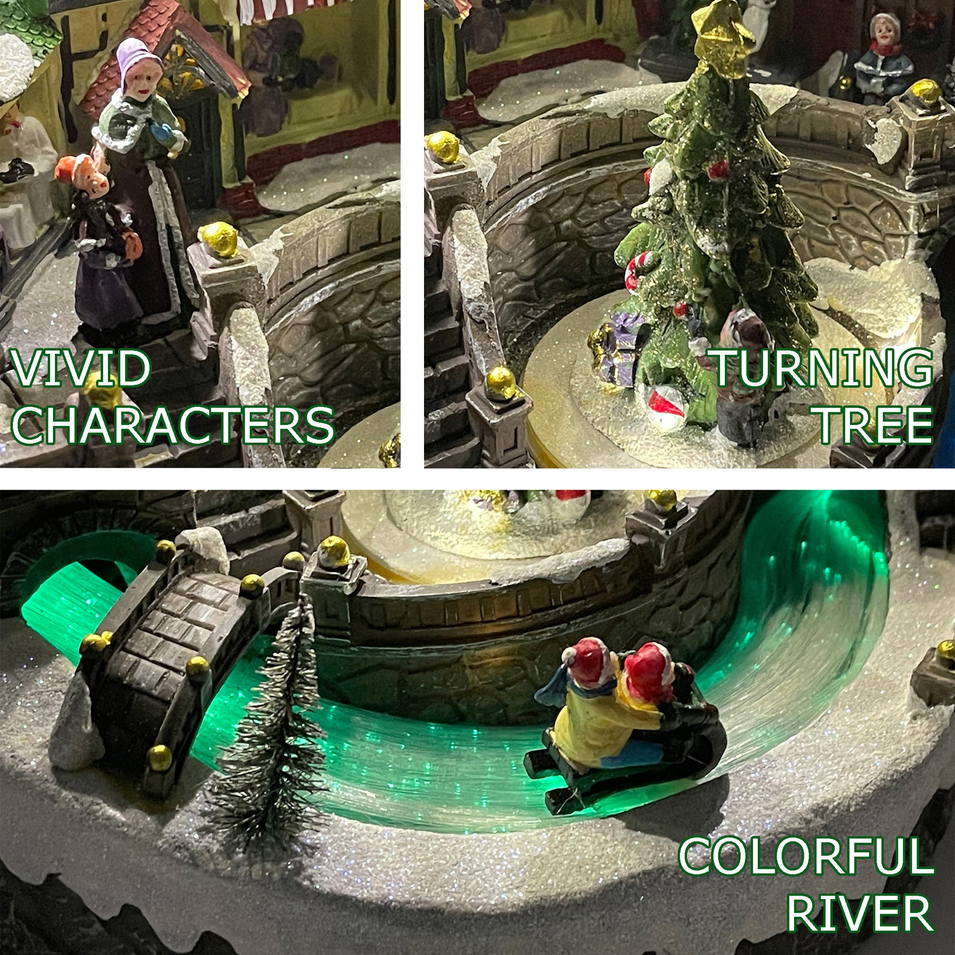- Handcrafted in detail, with top quality polyresin material. Features a turning Christmas tree in the center of small town with kids sledding - Color changing fiberoptics.