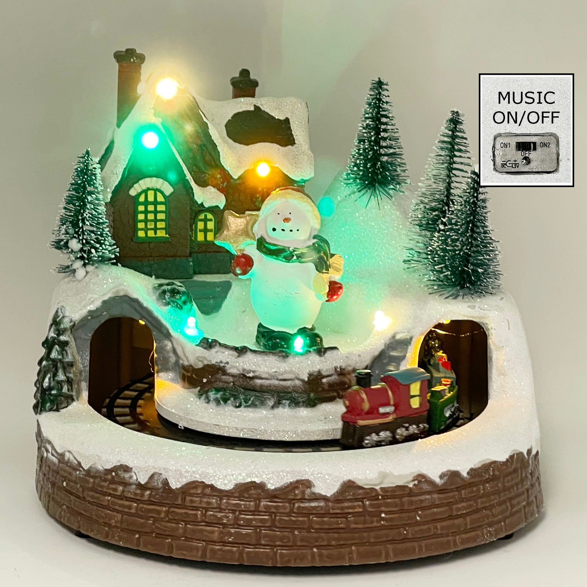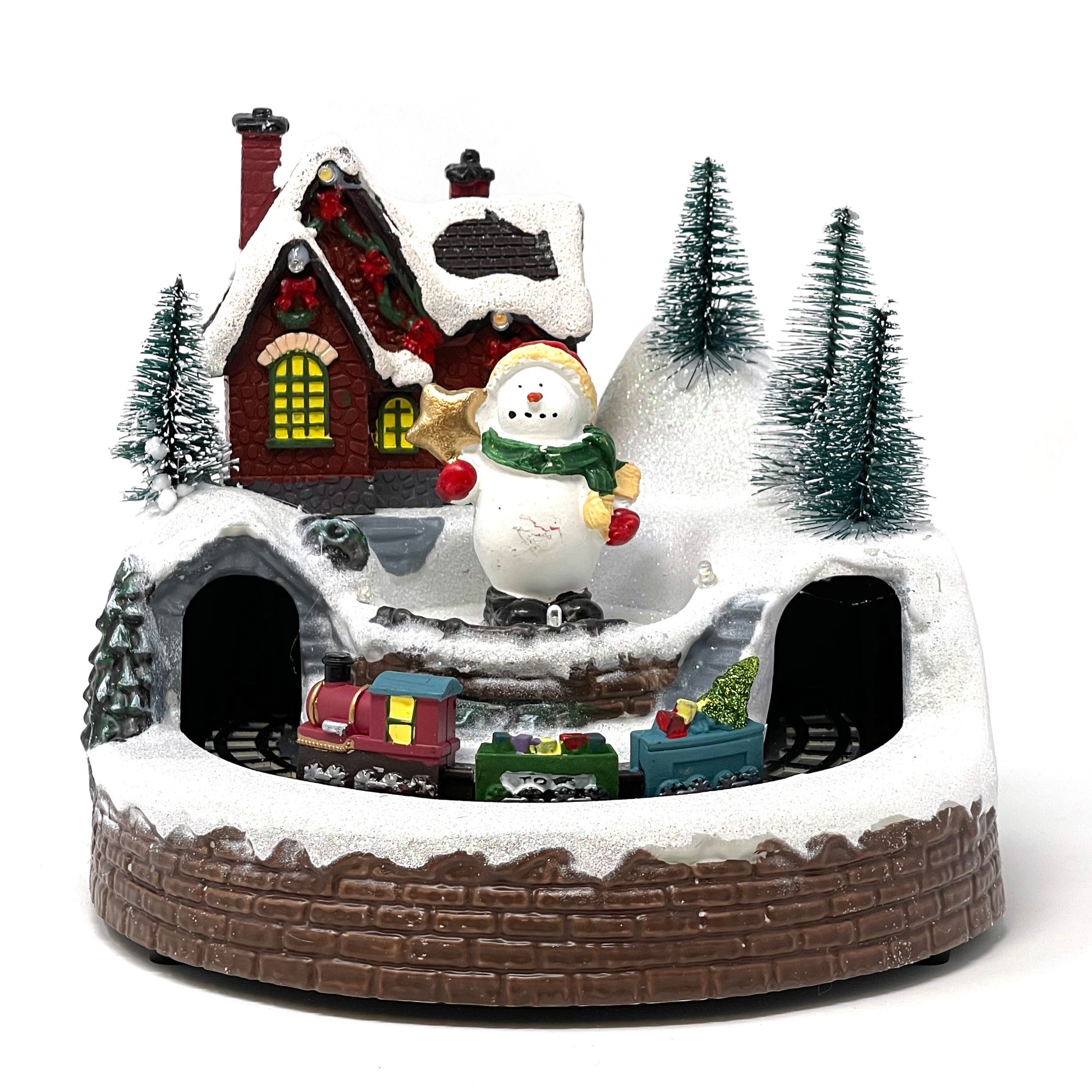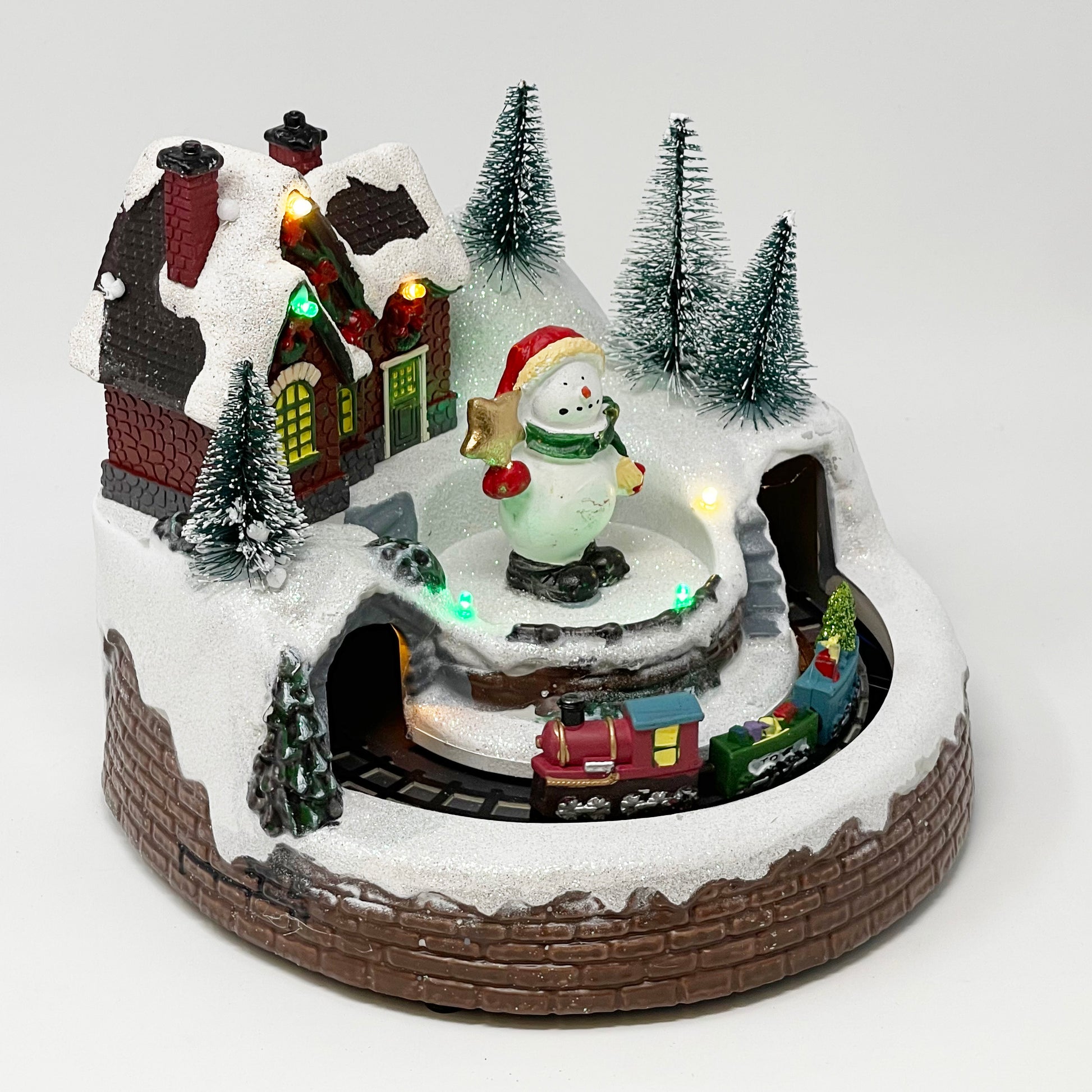 Crafted Polyresin Christmas House Collectable Figurine with USB and Battery Dual Power Source-Train Under Snowman-XH93425